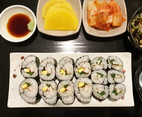세 번째 주인공은 'ㅅ' 식당의 김초밥입니다. 이곳은 김초밥을 ‘소박한 한 입 초밥’이라 표현합니다. 계란지단, 게맛살, 시금치 등 흔한 재료들을 한 줄에 곱게 말아냈지만, 그 조화가 아주 특별합니다. 이곳의 김초밥은 비단 김밥과 초밥의 중간쯤에 있는 것처럼 느껴지며, 입 안 가득 퍼지는 상쾌한 바다의 향이 인상적입니다. 짜지도 달지도 않고, 담백함 속에 은은하게 퍼지는 감칠맛이 있어 ‘매일 먹어도 질리지 않을 맛’이라는 평을 받습니다. 게맛살의 감칠맛과 계란의 부드러움, 시금치의 아삭함까지 삼위일체를 이루며, 초밥을 닮은 맛의 방향성은 식사를 넘어 ‘경험’에 가깝습니다.