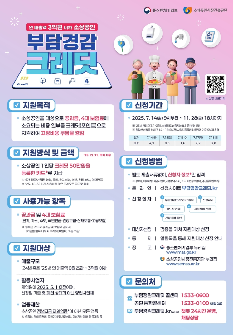 소상공인 여러분의 어깨를 가볍게 해드리기 위해 정부가 든든하게 지원하는 50만원 부담경감 크레딧은 전기, 가스, 수도와 같은 공공요금은 물론, 국민연금, 건강보험, 산재보험, 고용보험 등 4대 보험료 납부에 사용할 수 있도록 50만원 상당의 크레딧을 신용·체크·선불카드 형태로 지급하는 방식의 지원 사업이에요. 이 크레딧은 신청 시 여러분이 등록한 신용카드나 체크카드에 포인트처럼 지급되며, 해당 요금들을 결제할 때 자동으로 차감되어 편리하게 사용하실 수 있습니다.