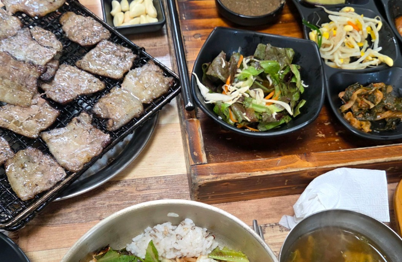 이 집이 특별한 이유는 바로 삼겹살을 구워내는 데 볏짚, 즉 ‘짚불’을 이용한다는 점입니다. 볏짚삼겹살, 혹은 짚불삼겹살로 불리는 이 음식은 일반 숯불구이와 달리 볏짚을 태워내는 불의 강렬한 열기와 특유의 연기가 고기에 깊게 스며들어 독특한 풍미를 만들어냅니다. 이 맛은 어디서도 느낄 수 없는 무안만의 별미로, 과거 밭일과 논일을 마친 어머니와 아버지, 그리고 일가가 한자리에 모여 볏짚을 모아 구워먹던 시골 풍경을 그대로 재현하고 있습니다.