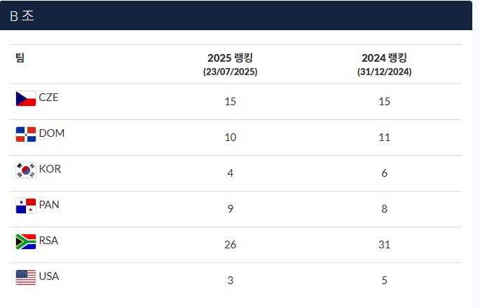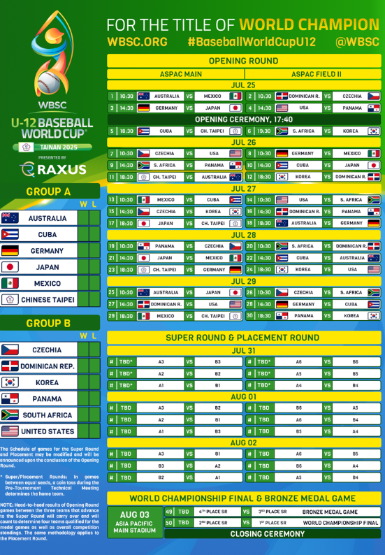 이번 대회에서 한국은 그룹 B에 속하여, 그룹 예선에서 남아프리카공화국, 도미니카공화국, 체코, 미국이라는 다양한 야구 강국들과 경쟁합니다. 조별 예선은 총 4경기로 진행되며, 일정은 현지 타이난 시간 기준으로 7월 25일 남아공전을 시작으로 7월 26일 도미니카공화국, 27일 체코, 28일 미국과 차례로 펼쳐집니다. 예선 경기는 모두 ASPAC B 구장에서 열리며, 대만과 한국의 시차는 1시간이므로 경기 시작 시간에 참고할 필요가 있습니다.