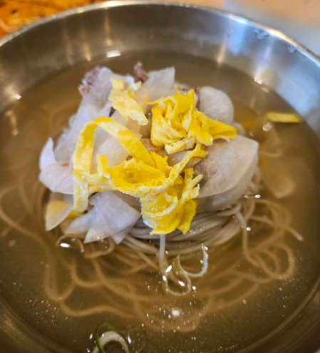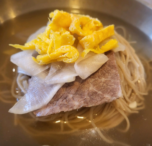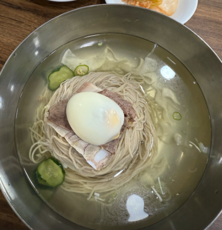면 또한 이곳만의 비법이 숨겨져 있습니다. 메밀 함량을 높여 찰기보다는 부드럽고 담백한 식감을 살리는 방식입니다. 직접 메밀을 공수해 매일 반죽을 하고 면을 뽑는 수작업을 고수하며, 주문이 들어온 뒤에야 삶아 내기 때문에 면발이 퍼지지 않고 고유의 풍미를 그대로 간직하고 있습니다. 특히 첫입을 물었을 때 느껴지는 고소한 메밀향과 시원한 육수가 만나, 평양냉면의 본질을 그대로 전하고 있다는 평을 받고 있습니다.