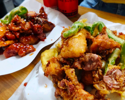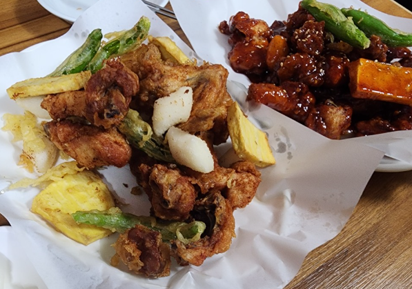 치킨 외에도 다양한 튀김 사이드 메뉴가 인기입니다. 쫄깃한 식감이 살아있는 닭똥집 튀김, 담백한 고구마 튀김, 매콤한 꽈리고추 튀김, 그리고 떡튀김 등이 함께 제공됩니다. 사이드 메뉴들은 기름진 맛을 잡아주면서도 치킨과 잘 어울려, 함께 곁들이면 식사가 더욱 풍성해집니다. 특히 고추튀김은 한입 베어 물면 고소함과 함께 은은한 매운맛이 퍼져 느끼함을 잡아주는 역할을 합니다.