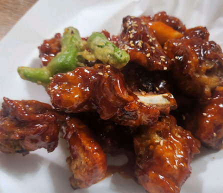 이 치킨은 맛뿐만 아니라 영양 면에서도 장점이 있습니다. 닭고기는 고단백 저지방 식품으로 근육 형성과 회복에 도움을 주며, 필수 아미노산이 풍부해 피로 회복에도 좋습니다. 특히 닭 가슴살 부분은 지방 함량이 낮아 다이어트를 하는 사람에게도 부담이 적습니다. 여기에 곁들여 나오는 고구마 튀김은 베타카로틴과 식이섬유가 풍부하여 눈 건강과 장 건강에 좋으며, 꽈리고추 튀김은 비타민 C와 항산화 성분이 많아 면역력 향상에 도움을 줍니다.