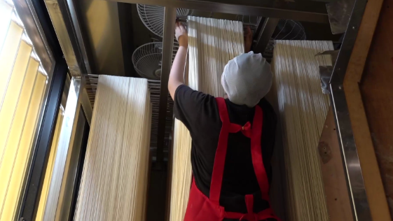 면발의 맛을 좌우하는 것은 반죽뿐 아니라 건조 과정에서도 결정됩니다. 특히 장마철처럼 습도가 높을 때는 그 관리가 더욱 까다롭습니다. 건조실의 온도를 40도로 유지하기 위해 보일러와 난로를 동시에 가동하며, 통풍구를 세심하게 조절해 최적의 상태를 유지합니다. 이 과정을 소홀히 하면 면발이 쉽게 상하거나 원하는 식감을 내기 어렵기 때문에, 주인장은 하루 종일 건조실을 오가며 꼼꼼히 점검합니다.