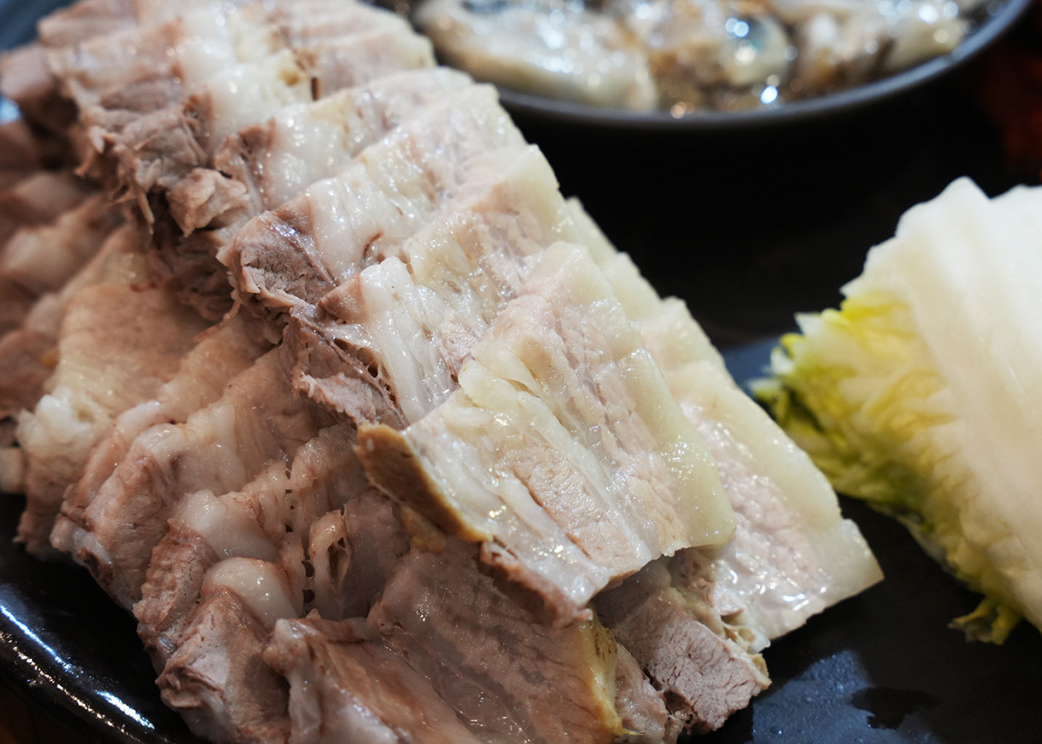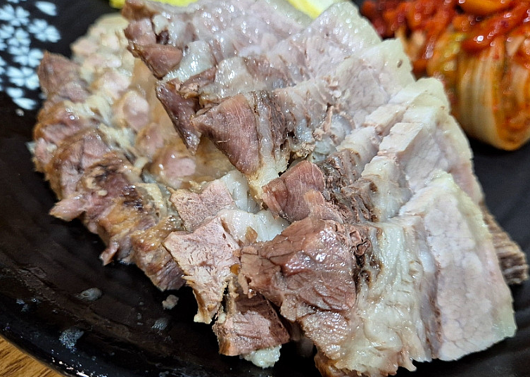 먼저 고기는 갈색 설탕, 다진 마늘, 그리고 소주를 넣은 양념에 하루 동안 재워 둡니다. 이렇게 하면 육질이 한층 부드러워지고 잡내가 사라진다고 합니다. 이후 어린 뽕나무 가지와 솔잎을 우려낸 향긋한 물에 고기를 삶는데, 이 과정에서 은은한 향이 배어들어 다른 곳에서는 쉽게 맛볼 수 없는 깊은 풍미가 완성됩니다. 특히 압력솥 대신 30년 된 가마솥에서 천천히 삶는 것이 비법입니다. 가마솥에서 오랜 시간 정성스럽게 익힌 삼겹살은 속까지 부드럽고 촉촉하며, 씹을수록 고소한 맛이 살아납니다.