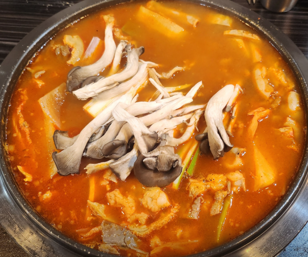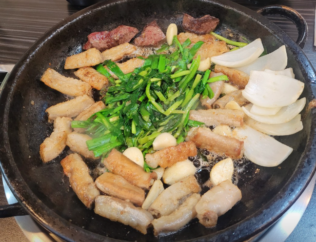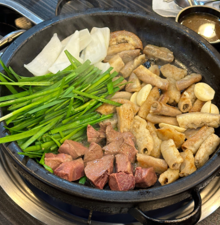 먼저 구이판 위에서는 곱창과 대창을 번갈아 올리며 기름의 성질을 조정합니다. 곱이 가득 찬 대창으로 달큰하고 버터 같은 풍미를 깔고, 곱창으로 바삭한 질감을 더하는 식이죠. 이때 염통은 미디엄 레어로 단숨에 불맛을 묻혀내면, 곱의 느끼함을 잡아주는 담백한 고기결이 훌륭한 사이드가 됩니다. 여기에 부추무침·양파절임·명이나물·쌈무 같은 산미·향채의 조합이 곁들여지며, 기름의 중후함을 씻어내고 다음 한 점을 부릅니다. 두 번째 막, 전골은 ‘국물의 흡입력’이 관건입니다.