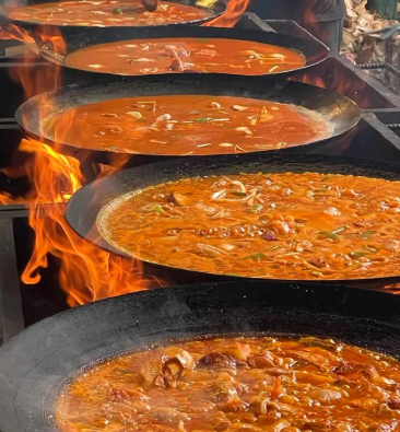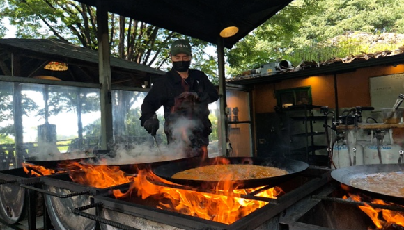 이제 섭씨 700도가 넘는 이글거리는 장작불 위, 10kg 무게의 솥뚜껑 위에서 미리 정성껏 양념에 재워둔 닭볶음탕을 끓이기 시작하는데요. 그 모습이 정말 장관이라고 합니다. 하지만 이게 끝이 아닙니다. 조리가 시작되면 중간중간 양념이 타지 않도록 쉴 새 없이 육수를 부어주고, 고기가 타거나 눌어붙지 않도록 계속해서 뒤집어주는 고된 과정이 반복됩니다. 불의 세기를 섬세하게 조절해야 하기 때문에 음식이 완성될 때까지 잠시도 자리를 떠날 수가 없다고 합니다.