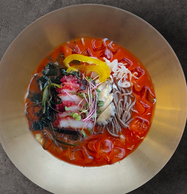 해물 갈비찜의 진한 맛을 잡아주는 해초 막국수는 그 자체로도 훌륭한 요리인데요. 보통 막국수 하면 메밀면을 떠올리지만, 이 집은 해초를 넣어 만든 독특한 면을 사용합니다. 해초 면은 쫄깃하면서도 톡톡 터지는 식감이 재미있고, 은은한 해초 향이 입안 가득 퍼져서 더욱 특별하게 느껴지는데요. 막국수에 들어가는 양념장도 직접 담근 고춧가루와 숙성된 매실액 등을 사용해서 새콤달콤한 맛이 일품이라고 합니다. 해물 갈비찜의 진한 맛을 즐기다가, 해초 막국수를 한입 먹으면 입안이 개운해져서 다시 갈비찜을 맛있게 즐길 수 있게 도와줍니다.