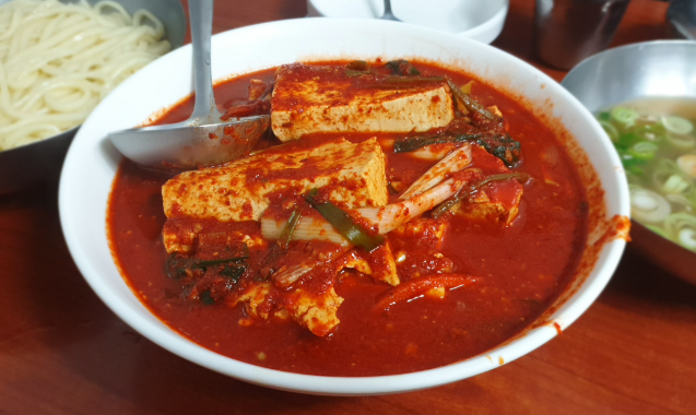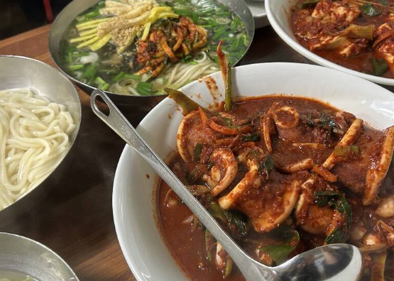 두부 두루치기는 부드럽고 담백한 두부에 매콤달콤한 고추장 양념을 더해 자작하게 끓여낸 음식입니다. 양념은 강하지 않고, 조화로운 간으로 두부 본연의 맛을 살려줍니다. 여기에 얇게 썬 대파와 양파가 어우러져 풍미를 더하고, 자작한 국물은 마치 찌개처럼 따뜻한 위로를 전합니다. 오징어 두루치기는 쫄깃한 오징어와 채소를 넉넉히 넣고 고추장 베이스 양념에 볶아낸 것으로, 매콤하면서도 감칠맛이 살아 있습니다. 특히 두루치기의 국물에 칼국수를 넣어 비벼 먹는 방식은 이 집만의 별미입니다. 걸쭉하게 우러난 국물에 칼국수가 적셔지면서 깊고 진한 맛을 느낄 수 있고, 배까지 든든히 채워주는 조합으로 손님들의 큰 사랑을 받고 있습니다.