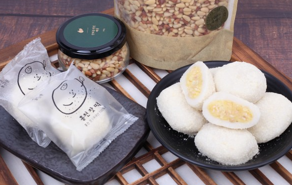 홍천 잣떡은 누룽지향이 은은하게 나는 홍천산 찹쌀 반죽에 홍천 잣을 아낌없이 넣어 쫀득하고 고소한 맛을 자랑합니다. 개발 1년 만에 백화점 팝업스토어에서 러브콜을 받았고, 군부대 명절 선물로도 선정되었습니다. 한 백화점에서 열린 팝업스토어에서는 하루 매출이 400만 원을 넘기기도 했으며, 최근에는 전년 대비 4배 이상 성장을 이루었습니다.