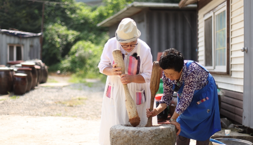 안성의 한 마을에는 3일에 한 번씩 쿵덕쿵덕 절구 찧는 소리가 울려 퍼지는 집이 있는데요. 그 소리의 주인공은 시어머니 김영희 씨와 며느리 한상연 씨입니다. 두 사람이 절구에 정성껏 찧는 건 다름 아닌 청국장입니다. 그런데 절구 속을 들여다보면 흔히 보던 노란 대두만 들어 있는 게 아닙니다. 그 사이사이로 까만 알갱이가 박혀 있는데, 바로 집에서 직접 농사지은 쥐눈이콩입니다.