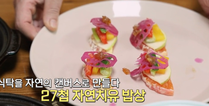 그녀가 차리는 밥상은 보통의 식탁과는 다릅니다. 무려 27가지 반찬이 오롯이 제철 재료로만 구성되어 있는데요. 손님 앞에 놓인 음식은 단순히 배를 채우는 수단이 아니라, 한 접시 한 접시마다 자연이 주는 치유의 힘을 담고 있습니다. 예쁘게 색을 내고 모양을 빚은 12가지 꽃정과 디저트는 마치 누비옷의 바느질 자국처럼 섬세하고 정갈합니다. 음식을 맛보는 순간, 누군가는 ‘작품 같다’고 말할 정도인데요. 그녀에게 음식과 바느질은 모두 삶을 지탱해준 예술이자 치유의 길입니다.