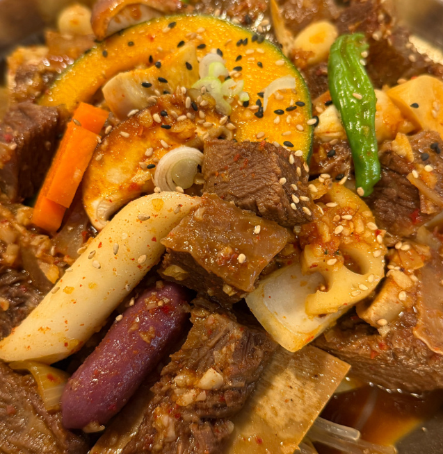 양념 또한 특별합니다. 기본적으로 간장, 마늘, 생강, 배, 사과 같은 천연 재료를 갈아 넣어 단맛과 감칠맛을 살리고, 여기에 고춧가루와 청양고추를 더해 은은한 매콤함을 입힙니다. 단순히 달고 짠 맛에 그치지 않고, 깊이 있는 양념이 고기 속까지 스며들어 먹는 순간 부드럽게 풀어지는 갈비살과 조화를 이룹니다.