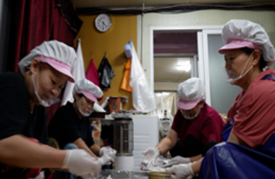 새벽부터 시작된 작업장은 늘 분주합니다. 찹쌀을 씻어 불리고, 알맞게 반죽을 치대는 손길은 멈추지 않고 송편 속에 들어가는 재료들도 직접 손질합니다. 고소한 깨와 달콤한 설탕, 부드러운 콩고물 등 모든 속 재료를 정성스럽게 준비해야 비로소 완벽한 송편이 완성됩니다. 뜨거운 찜기에서 피어오르는 김 사이로 땀이 흘러내리지만, 누구 하나 힘들다고 내색하지 않습니다.