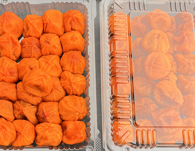 이런 정성이 깃든 곶감은 겉은 쫄깃하고 속은 말랑하게 녹아내리는 독특한 식감을 자랑합니다.또한 햇살에 의해 자연스럽게 형성되는 하얀분은 인공적인 첨가물이 전혀 없는 순수한 단맛의 증거로, 오직 전통 방식으로 말린 곶감에서만 볼 수 있는 특징입니다.