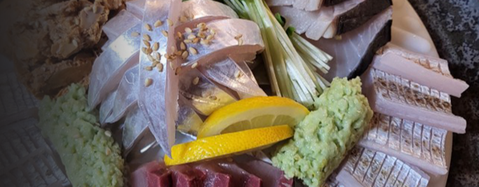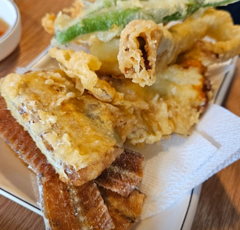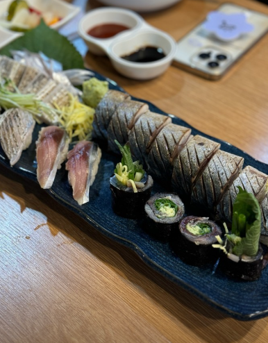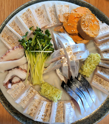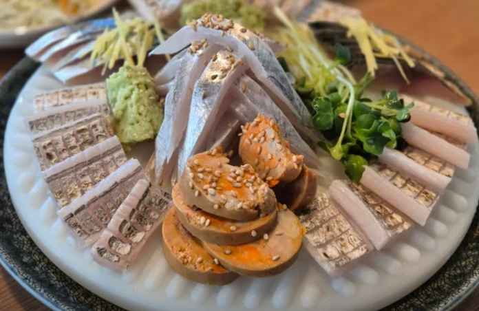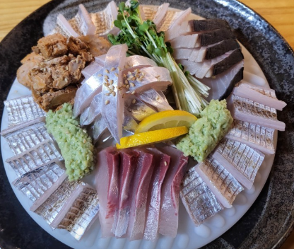 또 다른 별미는 갈치 다타끼(たたき)입니다. 겉은 빠르게 구워내고 속은 생으로 남겨, 바다의 향과 불맛이 동시에 느껴지는 요리입니다. 한입 베어 물면 부드러움 속에 은은한 불향이 번지며, 갈치가 가진 고유한 단맛이 고스란히 전해집니다.