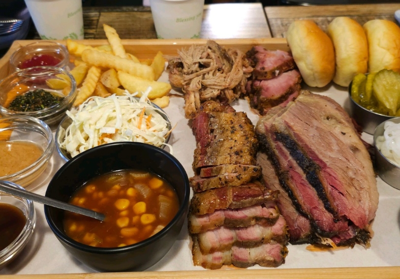 대표 메뉴인 바비큐 플래터에는 폴드포크, 브리스킷, 스페어립 등 세 가지 바비큐가 한 접시에 담겨 나옵니다. 덩어리째 훈연된 고기를 썰면 육즙이 가득 흐르며, 불에 살짝 그을린 표면에서는 향긋한 훈연 향이 퍼집니다. 한입 베어 물면 부드럽고 촉촉한 육질이 입안을 가득 채우며, 오랜 시간 정성스럽게 구운 고기만이 낼 수 있는 깊은 풍미가 느껴집니다.