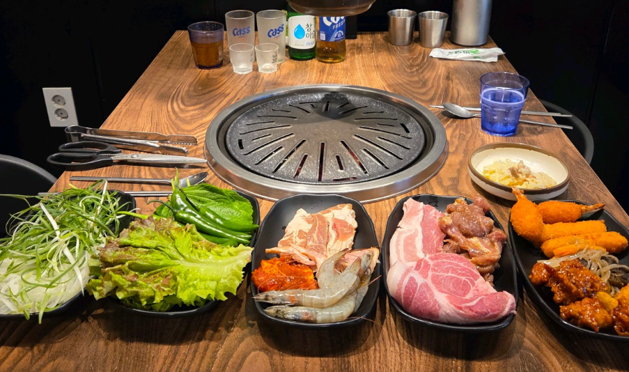 고기만 있는 게 아닙니다. 이곳의 또 다른 인기 비결은 바로 ‘새우 셀프바’. 직접 새우를 가져다 구워 먹을 수 있는데, 탱글탱글한 식감과 감칠맛이 일품입니다. 게다가 다양한 밑반찬과 샐러드, 쌈야채, 각종 소스까지 풍성하게 준비되어 있어 누구나 자신만의 조합으로 식사를 즐길 수 있습니다.