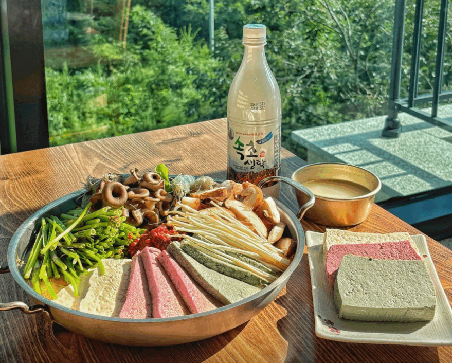 여기에 정선의 붉은 비트, 보성의 녹차와 쑥 가루를 더해서 색감은 물론 건강함까지 제대로 담았다고 하는데요. 흰색, 녹색, 붉은색 세 가지 두부가 전골 안에서 고운 빛깔로 어우러지는데, 그 모습 자체가 하나의 작품을 보는 듯한 느낌이 든다고 합니다.