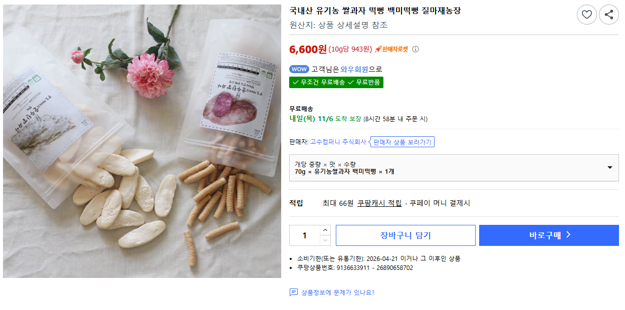 오늘 6시내고향에서는 고창의 깨끗한 자연 속에서 자란 유기농 쌀로 만든 과자의 매력과, 그 안에 담긴 사람들의 따뜻한 이야기를 만나볼 수 있습니다. 전통과 정직함, 그리고 건강한 맛이 어우러진 이곳의 유기농 쌀과자는 앞으로도 많은 사람들에게 사랑받는 고창의 대표 특산물로 자리할 것입니다.6시내고향 유기농 쌀과자 떡벙 택배 주문하는곳