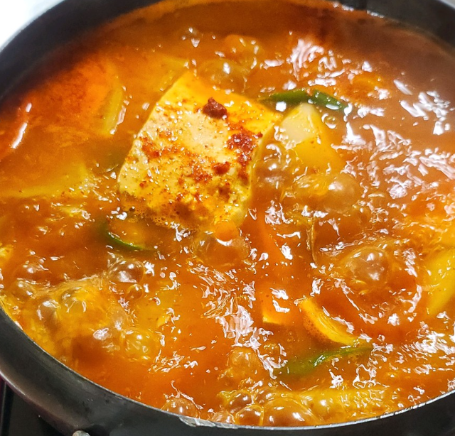 이 집의 대표 메뉴는 단연 먹갈치조림입니다. 커다란 냄비에 두툼한 갈치 토막이 층층이 쌓이고, 그 위로 무와 감자, 대파, 청양고추가 듬뿍 얹힙니다. 그리고 마지막으로 비장의 양념장이 더해집니다. 할머니표 양념장의 핵심은 바로 ‘멜간장’. 북어, 인삼, 파뿌리, 고추씨를 넣고 정성껏 끓인 육수에 3년간 숙성한 멸치액젓(멜젓)을 조선간장과 섞어 한소끔 끓여 만든 뒤, 항아리에 꽁꽁 봉인해둔 감칠맛의 비밀입니다. 이 멜간장을 더해 조림을 끓이면 국물의 맛이 한층 깊어지고, 갈치 특유의 바다 향이 진하게 살아납니다.