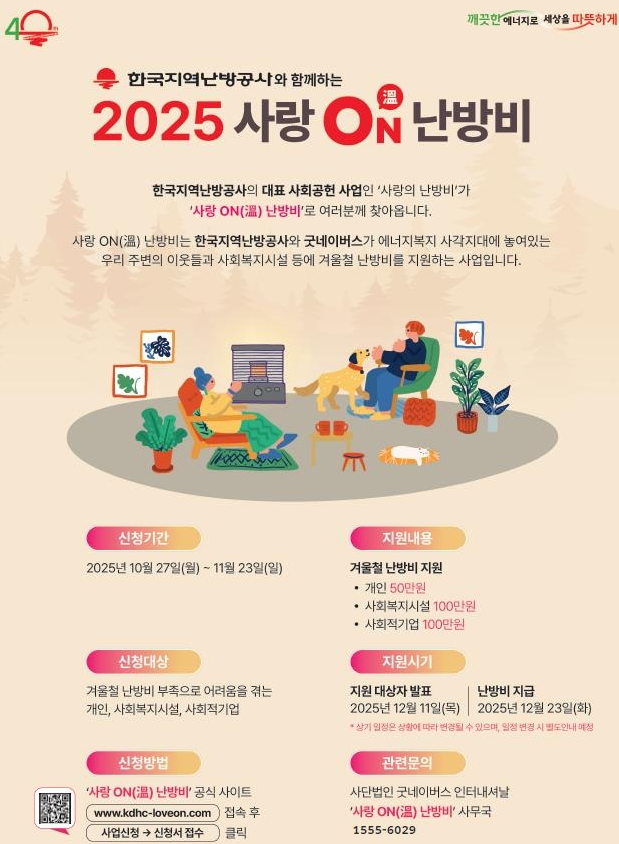 한국지역난방공사가 올겨울 난방비 부담을 덜기 위해 에너지 취약계층을 대상으로 ‘사랑 ON(溫) 난방비’ 지원 사업을 확대 실시합니다. 사랑온난방비 50만원 지원 신청 홈페이지사이트 접수를