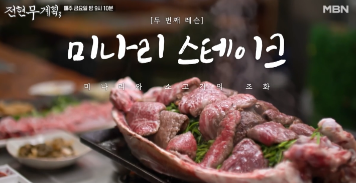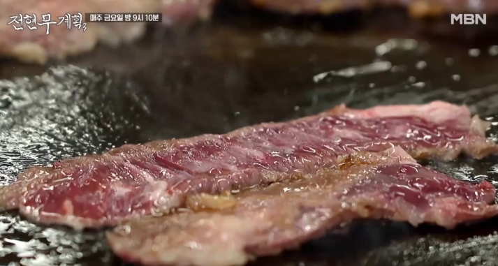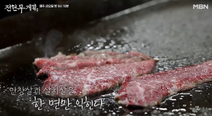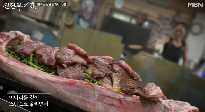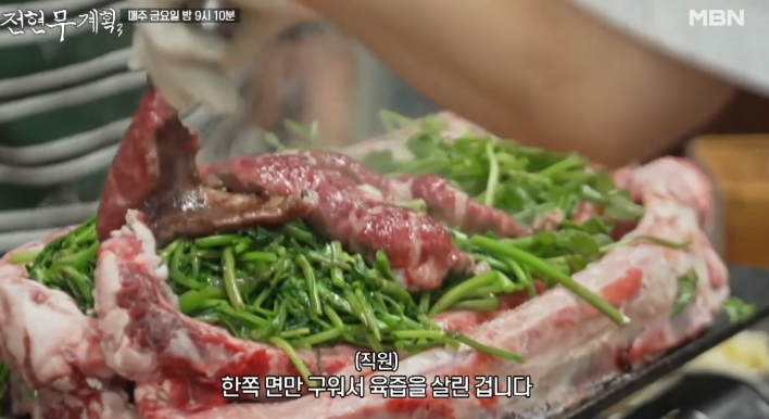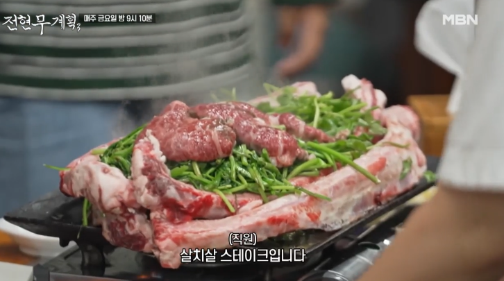 신선한 육사시미에 이어, 철판 위에서 지글지글 익어가는 안창살과 살치살 스테이크가 등장하자 현장은 금세 고소한 향으로 가득 찼는데요. 불판 위에는 고기와 함께 미나리, 표고버섯이 곁들여져 그 향과 맛을 더욱 풍부하게 만들어주었고, 사장님은 “이 미나리가 고기의 느끼함을 잡아줘요”라며 직접 비법을 설명했습니다.