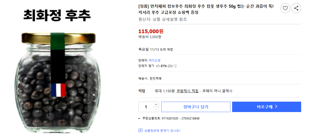 최화정 선생님이 방송하면 정말 핫한 제품을 소개 해서 항상 자주 보는 편입니다 그중에 요즘 핫한 주방 아이템이라면 바로 이 후추 이야기를 빼놓을 수가 없습니다. 특히 유튜브 영상에서 캐리어에 챙겨간 후추가 도대체 뭘까 하고 궁금했었는데 그래서인지 덕분에 입소문을 제대로 타버린 후추인데요 바로 '캄폿 후추' 이야기입니다. 이 후추가 얼마나 인기가 많은지 한 번 사려고 마음먹었다가도 품절 대란에 쉽사리 구할 수가 없어서 애를 먹는 분들이 정말 많았다고 합니다 저는 아래에서 구매했는데 참고하시면 좋을것 같네요 최화정 후추 먼치페퍼 아래를 통해서 주문하시기 바랍니다