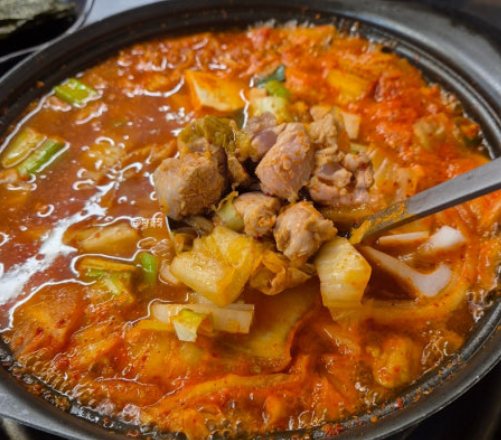 이곳의 대표 메뉴인 매콤돼지갈비전골은 보기만 해도 군침이 도는 비주얼로 유명합니다. 진하게 우려낸 사골 육수에 양념한 돼지갈비를 넣고 끓이는데, 국물은 처음엔 달콤하면서도 점점 깊은 매운맛이 올라오는 게 특징입니다.특히 직접 만든 특제 양념장이 맛의 핵심입니다. 사과, 배, 마늘, 고추, 간장, 청양고추 등 10여 가지 재료를 배합해 24시간 숙성시키기 때문에 감칠맛이 강하고 자극적이지 않습니다. 고기를 한입 베어 물면 연탄불 향이 은은히 감돌고, 부드러운 육질 속에 매콤한 양념이 스며들어 입안을 꽉 채웁니다.