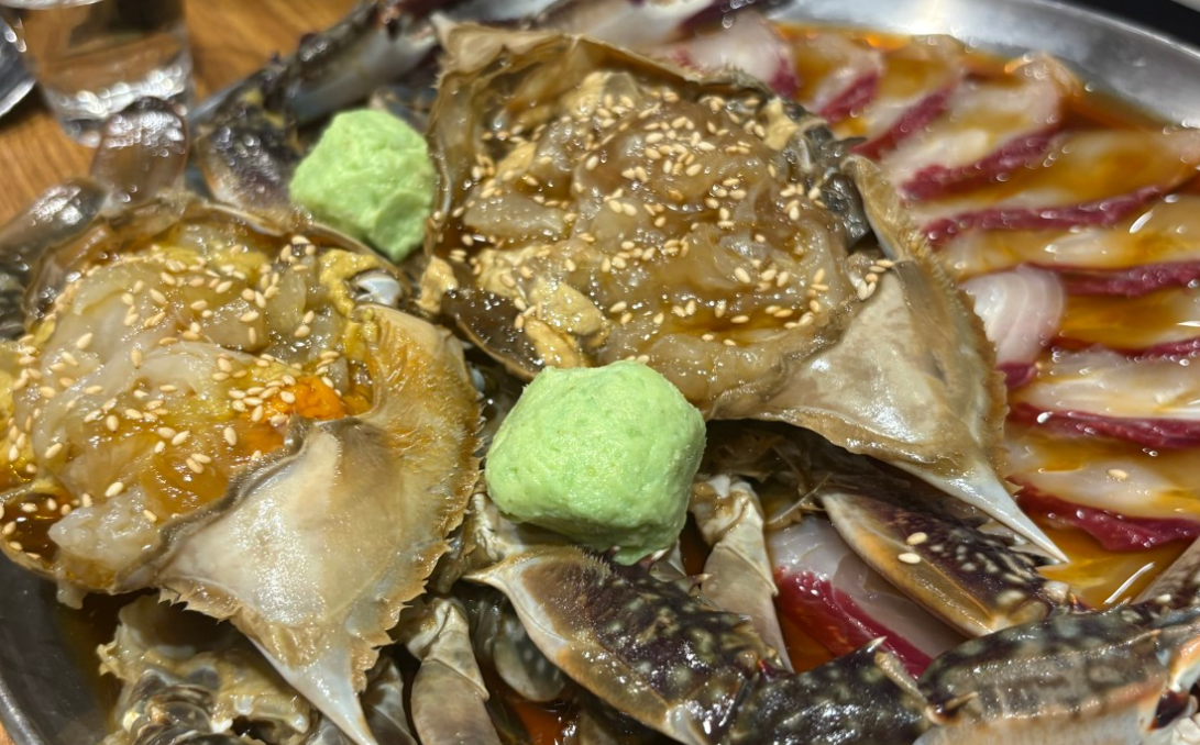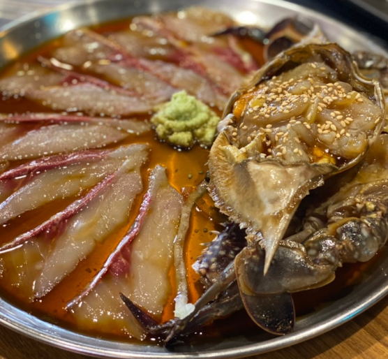 게장초밥(게장스시)은 이 집의 시그니처 메뉴 중 하나로, 간장에 재운 회(보통 숭어나 광어)를 밥 위에 얹고, 그 위에 부드러운 게살을 듬뿍 올린 형태로 제공됩니다. 밥에는 고추냉이를 약간 얹어 단맛과 매콤함, 그리고 짭조름한 게장 소스가 함께 어우러져 한 입 먹을 때마다 풍미가 깊이 퍼집니다. 게살의 단맛과 게장 소스의 감칠맛, 회의 신선함이 조화를 이루어 색다른 초밥 경험을 선사한다는 평가가 많습니다.