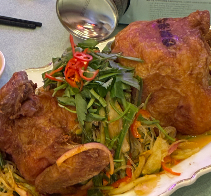 단순히 메뉴 수만 많은 것이 아니라, 각각의 요리가 하나의 스토리처럼 이어지며 풍미의 변주를 만들어냅니다. 그중에서도 단연 압도적인 존재감으로 손님들의 시선을 사로잡는 메뉴는 첫 코스이자 대표 메뉴인 홍콩식 치킨입니다.