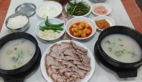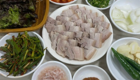 아침 장을 보러 온 주민들이 따끈한 죽 한 그릇에 힘을 얻고 다시 일상으로 돌아가는 모습은 시장에서만 볼 수 있는 정겨운 풍경이기도 합니다.관문상가시장을 대표하는 또 하나의 메뉴는 바로 수육백반입니다.수육은 삶는 과정에서 불필요한 기름을 쏙 빼고 고기의 본래 맛만 남기기 때문에 구이보다 훨씬 담백하고 부드러운 식감을 자랑합니다.